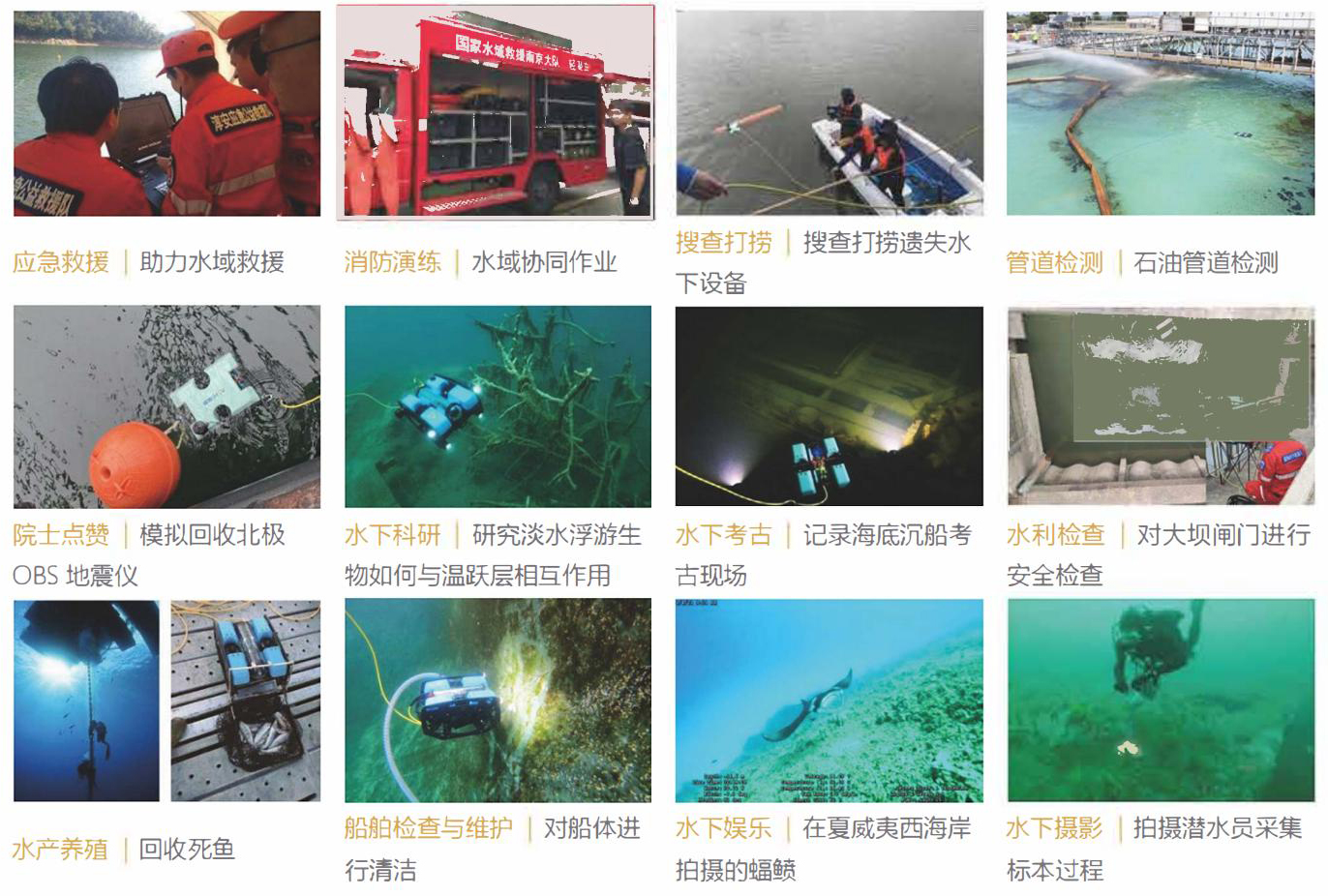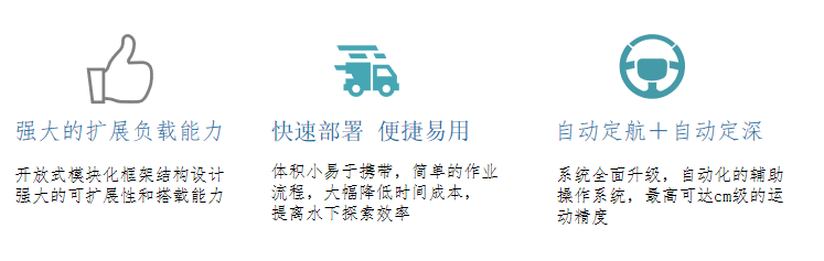 優越的工業級設計,使其具有強大的兼容性及廣泛的適應性,也可集成搭載多種功能模塊,滿足不同的行業需求。如可輕松搭載集成機械手和聲吶等水下設備展開水下救援工作
