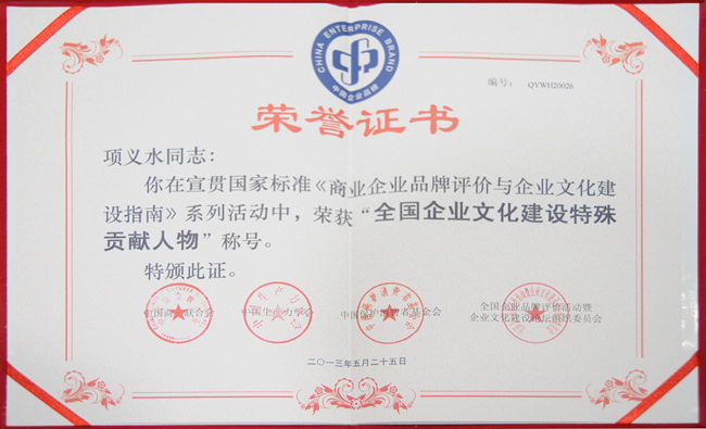 5月25日,在北京釣魚臺國賓館召開的“紀念‘服務與品牌’國標實施一周年暨全國企業(yè)文化建設論壇”上,華億集團和集團董事長項義水分別被授予“全國企業(yè)文化建設優(yōu)秀企業(yè)”和“全國企業(yè)文化建設特殊貢獻人物”榮譽稱號。