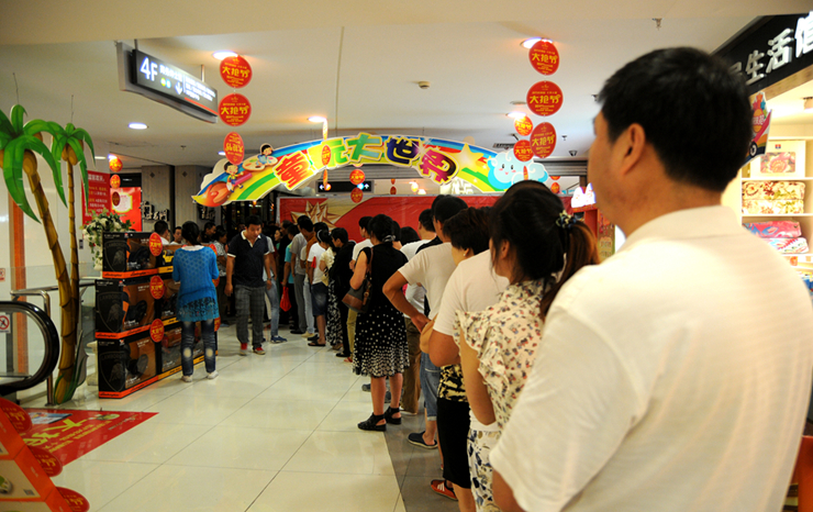雖然華億國際工作人員百般解釋,搶“蘋果”手機和電動車需要憑繳費小票,先到先得,但在華億國際A座三樓,B座五樓,消費者提前數小時在禮品登記處排隊等候,相互交流著“搶”的技巧。臨近晚上11時,不少排隊的消費者興奮地數著倒計時,“還有1分鐘……30秒……11點啦……”一場比拼速度的接力賽已然開始。