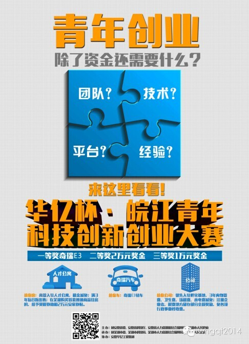 “讓創(chuàng)新創(chuàng)業(yè)人才實(shí)現(xiàn)‘有車(chē)有房有公司’夢(mèng)想,無(wú)疑吸引外界眼球,而這一夢(mèng)想僅‘一步之遙’。”據(jù)團(tuán)市委相關(guān)負(fù)責(zé)人介紹,11月28日,“華億杯”皖江青少年科技創(chuàng)新創(chuàng)業(yè)大賽半決賽結(jié)果出爐,非制造業(yè)組和制造業(yè)組各有10組項(xiàng)目順利入圍決賽,在12月中旬將分別迎來(lái)最終“較量”。大賽的一等獎(jiǎng)將獲得奇瑞E3轎車(chē)一輛,二三等獎(jiǎng)分別獲得人民幣2萬(wàn)元和1萬(wàn)元獎(jiǎng)勵(lì)。此外,對(duì)落戶蕪湖創(chuàng)業(yè)的獲獎(jiǎng)團(tuán)隊(duì),有關(guān)部門(mén)將予以“房、車(chē)、公司”為標(biāo)志的一系列豐厚獎(jiǎng)勵(lì)。