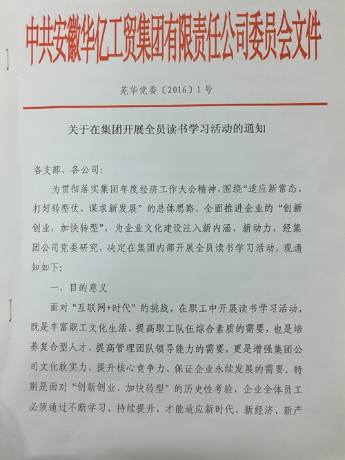4月11日,華億集團(tuán)黨委、團(tuán)委根據(jù)集團(tuán)2016年度經(jīng)濟(jì)工作大會(huì)精神,圍繞“適應(yīng)新常態(tài)、打好轉(zhuǎn)型仗、謀求新發(fā)展”的總體思路,聯(lián)合下發(fā)了關(guān)于在集團(tuán)內(nèi)部開展讀書學(xué)習(xí)活動(dòng)的通知。旨在通過(guò)開展為期90天讀書學(xué)習(xí)活動(dòng),為全公司形成常態(tài)化學(xué)習(xí)風(fēng)氣打下基礎(chǔ)。通過(guò)不斷提升員工的學(xué)習(xí)力,為企業(yè)文化建設(shè)注入新內(nèi)涵、新動(dòng)力,從而加快加實(shí)推進(jìn)企業(yè)的“創(chuàng)新創(chuàng)業(yè),加快轉(zhuǎn)型”。