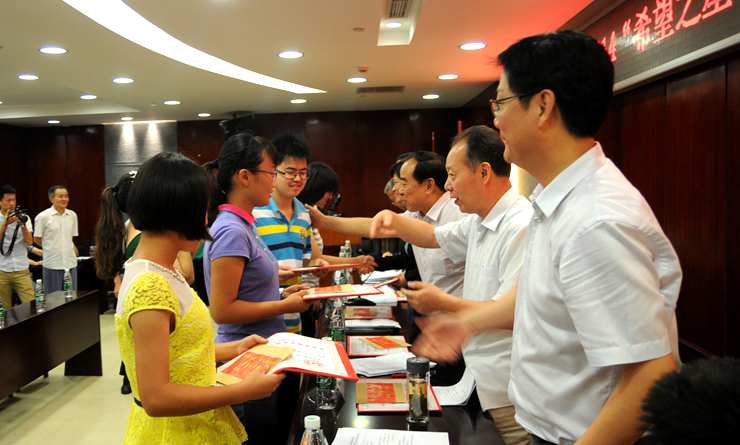 8月20日上午,蕪湖市愛心助學(xué)基金會舉行2015年度“希望之星”華億獎學(xué)金頒獎儀式。18位在今年中、高考中取得優(yōu)異成績的學(xué)生獲獎。 -