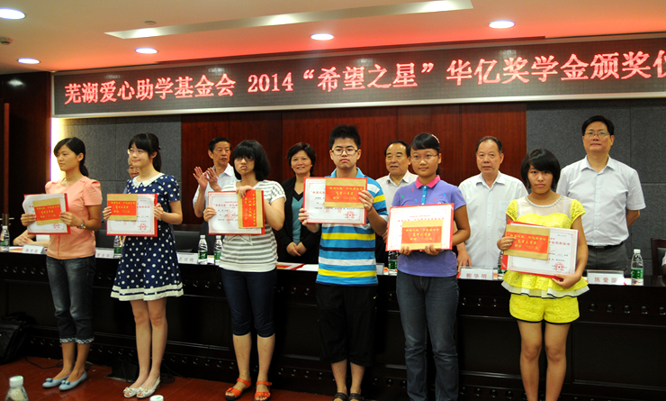 • 8月20日上午,蕪湖市愛心助學(xué)基金會(huì)舉行2015年度“希望之星”華億獎(jiǎng)學(xué)金頒獎(jiǎng)儀式。18位在今年中、高考中取得優(yōu)異成績(jī)的學(xué)生獲獎(jiǎng)。