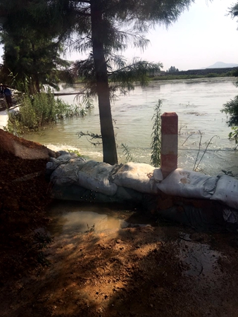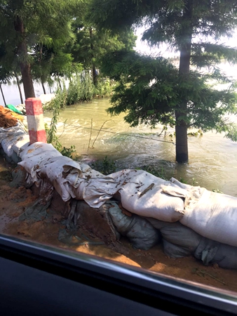 在去平鋪鎮(zhèn)的路途中,我們經(jīng)歷了小小的波折,剛過漳河大橋不遠處,地勢低洼,路面積水約1米左右,救援車隊無法通行。無奈之下,我們選擇了鄉(xiāng)村小路繞過積水路段,原本狹窄的圩堤道路隨處可見圍堵洪水的沙袋和黃土堆,使得車輛通行變得十分困難,農(nóng)田和圩區(qū)成了一望無際的“海洋”,讓我們切身體會到災情的嚴重,以及救災的困難程度。