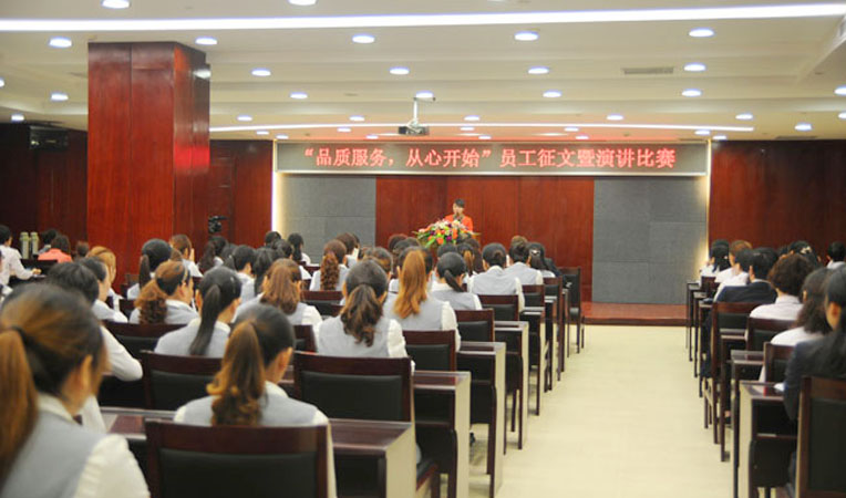 2012年10月18日上午,“微笑服務(wù)、溫馨窗口” 系列活動(dòng)之三——“品質(zhì)服務(wù),從心開始”員工征文暨演講比賽在華億國際7樓報(bào)告廳舉行。華億集團(tuán)副董事長(zhǎng)、華億國際副總經(jīng)理章國琴,華億集團(tuán)副總裁張靖,偉晨文化總經(jīng)理兼華億國際副總經(jīng)理孫艷,華億國際藝術(shù)總監(jiān)潘金華等擔(dān)任此次比賽評(píng)委。華億國際經(jīng)營(yíng)班子成員和員工代表近200人參加了活動(dòng)。
